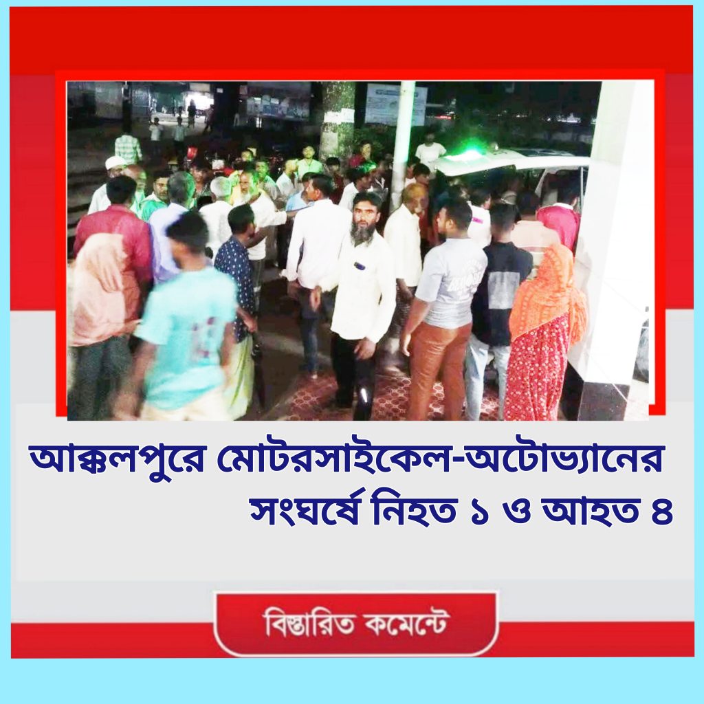 জয়পুরহাটের আক্কেলপুরে মোটরসাইকেল ও ব্যাটারিচালিত অটো ভ্যানের মুখোমুখি সংঘর্ষে রত্না আক্তার ছবি (৪৫) নামে এক গৃহবধূ নিহত হয়েছেন। দুর্ঘটনায় এক পুলিশ সদস্যসহ আরও চারজন গুরুতর আহত হয়েছেন। নিহত গৃহবধূ রুকিন্দিপুর ইউনিয়নের সাবেক চেয়ারম্যান রেজাউল করিম তরুনের দ্বিতীয় স্ত্রী।