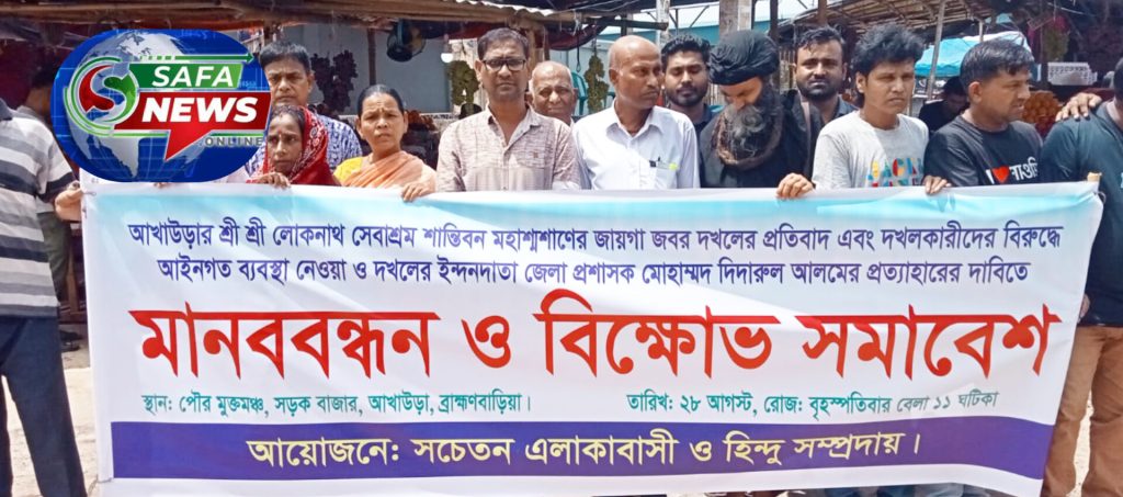 ব্রাহ্মণবাড়িয়ার আখাউড়ায় শান্তিবন মহাশ্মশানের জায়গা দখলের প্রতিবাদে মানববন্ধন ও বিক্ষোভ সমাবেশ অনুষ্ঠিত হয়েছে। একই সঙ্গে দখলকারীদের বিরুদ্ধে আইনগত ব্যবস্থা গ্রহণ এবং দখলের ইন্ধনদাতা হিসেবে অভিযোগ ওঠা জেলা প্রশাসক মোহাম্মদ দিদারুল আলম কে প্রত্যাহারের দাবি জানানো হয়। বৃহস্পতিবার সকাল ১১ টার দিকে সচেতন এলাকাবাসী ও হিন্দু সম্প্রদায়ের আয়োজনে আখাউড়া পৌর মুক্তমঞ্চে এই মানববন্ধন ও বিক্ষোভ সমাবেশ অনুষ্ঠিত হয়। এর আগে শত শত নারী-পুরুষ পৌর শহরের সড়ক বাজারে সমবেত হয়ে মুক্তমঞ্চের সামনে মানববন্ধন করেন। পরে সুশীল সমাজের প্রতিনিধি, বিভিন্ন রাজনৈতিক দলের নেতা এবং হিন্দু সম্প্রদায়ের লোকজন এতে একাত্মতা প্রকাশ করলে মানববন্ধনটি দীর্ঘায়িত হয়ে সড়ক বাজার থেকে রেলস্টেশন পর্যন্ত বিস্তৃত হয়। সমাবেশে বক্তব্য রাখেন রাধামাধব আখড়া ও কেন্দ্রীয় মন্দিরের সভাপতি চন্দন কুমার ঘোষ, সাধারণ সম্পাদক অলক কুমার চক্রবর্তী, লোকনাথ সেবাশ্রম ও শান্তিবন মহাশ্মশান পরিচালনা কমিটির সভাপতি হীরালাল সাহা, লোকনাথ সেবাশ্রমের পূজারী আশীষ ব্রহ্মচারী, জেলা হিন্দু মহাজোটের নির্বাহী সভাপতি অ্যাডভোকেট জয় লাল শীল, জেলা পূজা উদযাপন ফ্রন্টের সদস্য সচিব, সাংবাদিক প্রবীর চৌধুরী রিপন, সাবেক পৌর কাউন্সিলর ও উপজেলা বিএনপি নেতা মনতাজ মিয়া, পৌর যুবদলের আহ্বায়ক জাবেদ আহমদ ভূঁইয়া, ডা.ভজন দেব, ডা. পলাশ মজুমদার, প্রভাষক সুভাষ দাস, দুলাল ঘোষ জয়সহ অনেকে। বক্তারা আগামী ২৬ সেপ্টেম্বরের মধ্যে মহাশ্মশানের জায়গা উদ্ধারের আল্টিমেটাম দেন। নির্ধারিত সময়ের মধ্যে প্রশাসন কার্যকর উদ্যোগ না নিলে আসন্ন শারদীয় দুর্গোৎসব বন্ধ রাখার হুঁশিয়ারি দেন তারা।