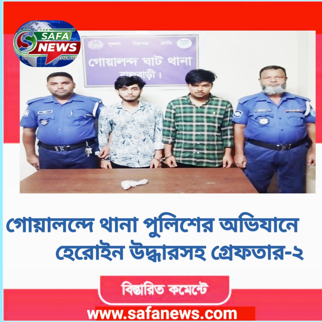 রাজবাড়ীর গোয়ালন্দ থানা পুলিশের বিশেষ অভিযানে ১০০ শত পুরিয়া হেরোইন যার ওজন ১০ গ্রামসহ ২ জন মাদক ব্যবসায়ীকে গ্রেফতার করেছে থানা পুলিশ।