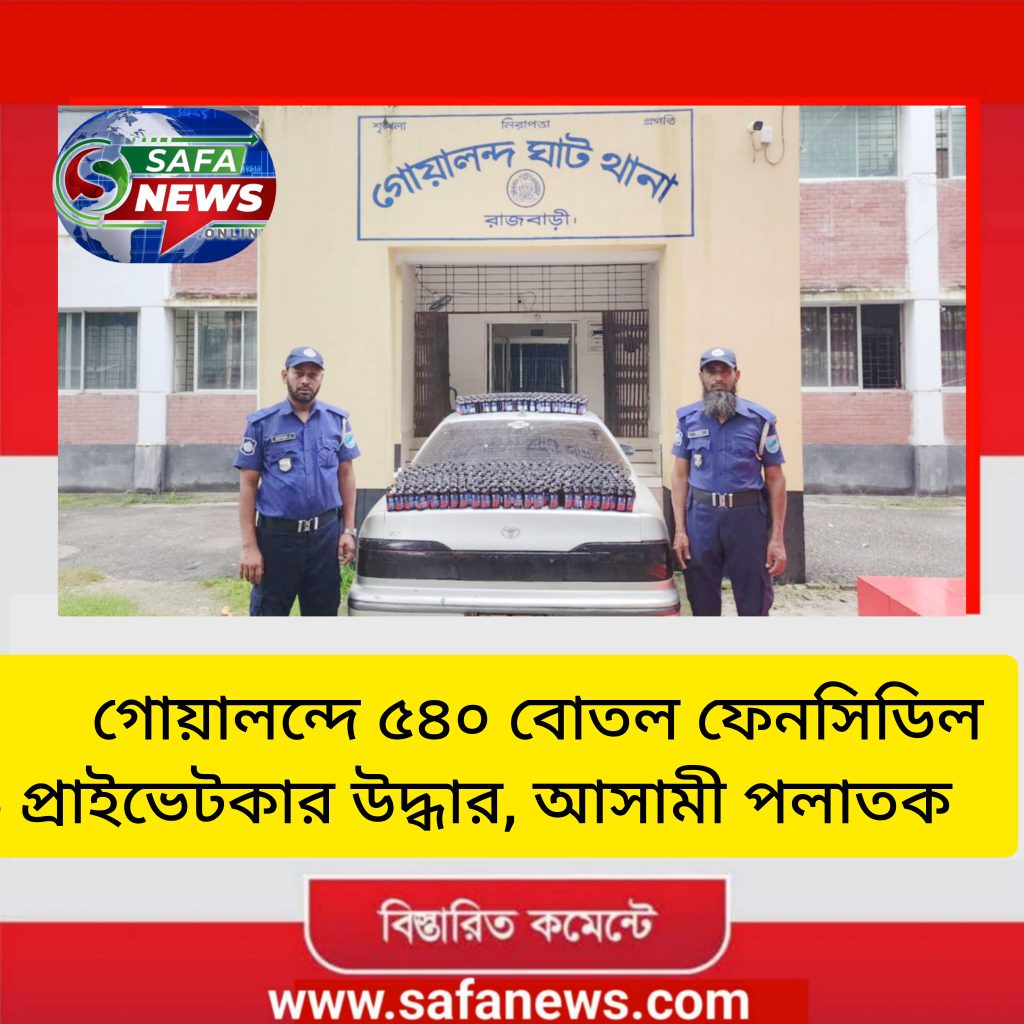 থানা পুলিশ সূত্রে জানা যায়, ১৬ জুলাই বুধবার বিকেল ৩:১৫ মিনিটের দিকে গোয়ালন্দ ঘাট থানা অফিসার ইনচার্জ মোহাম্মদ রাকিবুল ইসলামের দিকনির্দেশনায় নিয়মিত অভিযান চলাকালীন সময়ে দৌলতদিয়া মাইক্রো স্ট্যান্ড হতে একটি প্রাভেটকারে তল্লাশি চালিয়ে ৫৪০ বোতল ফেনসিডিলসহ গাড়িটি উদ্ধার করা হয়।