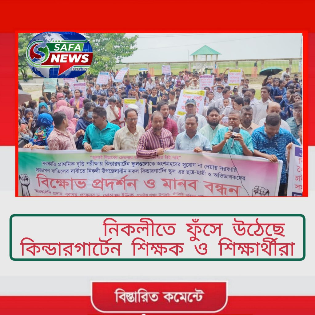 প্রাথমিক বৃত্তি পরীক্ষায় কিন্ডারগার্টেনসহ বেসরকারি স্কুলের শিক্ষার্থীদের অংশগ্রহণ বাতিলের সিদ্ধান্তের প্রতিবাদে উত্তাল ও অন্তর্ভুক্তির দাবি ফুঁসে উঠেছে নিকলী উপজেলার কিন্ডারগার্টেনের শিক্ষক শিক্ষার্থীরা। তারা কিন্ডারগার্টেন শিক্ষার্থীদের বাদ দিয়ে প্রকাশিত পরিপত্রটি প্রত্যাহার ও এসব শিক্ষাপ্রতিষ্ঠানের শিক্ষার্থীদের বৃত্তি পরীক্ষায় অংশগ্রহণের সুযোগ দেয়ার দাবি জানান।