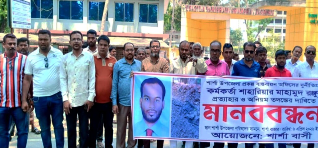 সোমবার (৬ এপ্রিল ২০২৬) সকাল ১১টার দিকে শার্শা উপজেলা পরিষদের সামনে যশোর-বেনাপোল মহাসড়কে এই কর্মসূচি অনুষ্ঠিত হয়। এতে বিভিন্ন ইউনিয়নের জনপ্রতিনিধি, রাজনৈতিক নেতাকর্মী এবং সাধারণ মানুষ অংশ নেন। মানববন্ধন শেষে উপজেলা নির্বাহী কর্মকর্তার (ইউএনও) কাছে একটি স্মারকলিপি দেওয়া হয় এবং পরে ইউএনও কার্যালয়ের সামনে সংক্ষিপ্ত অবস্থান কর্মসূচিও পালন করা হয়।
