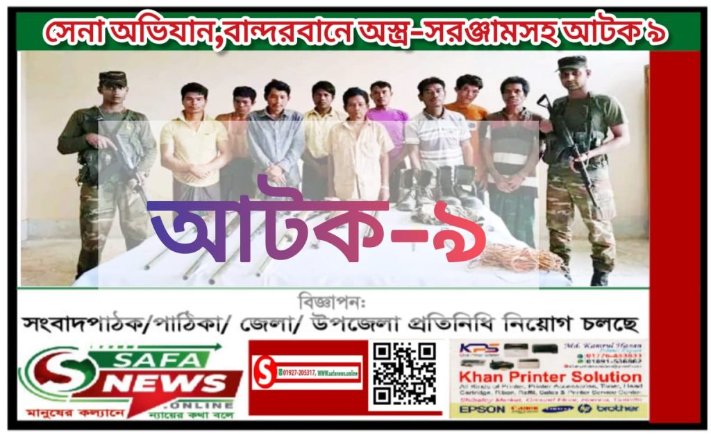 লামা উপজেলার চাঁদাবাজি ও অপহরণের সাথে জড়িত সন্দেহে ৯ জনকে অস্ত্র সরঞ্জামসহ আটক করেছে সেনাবাহিনী।